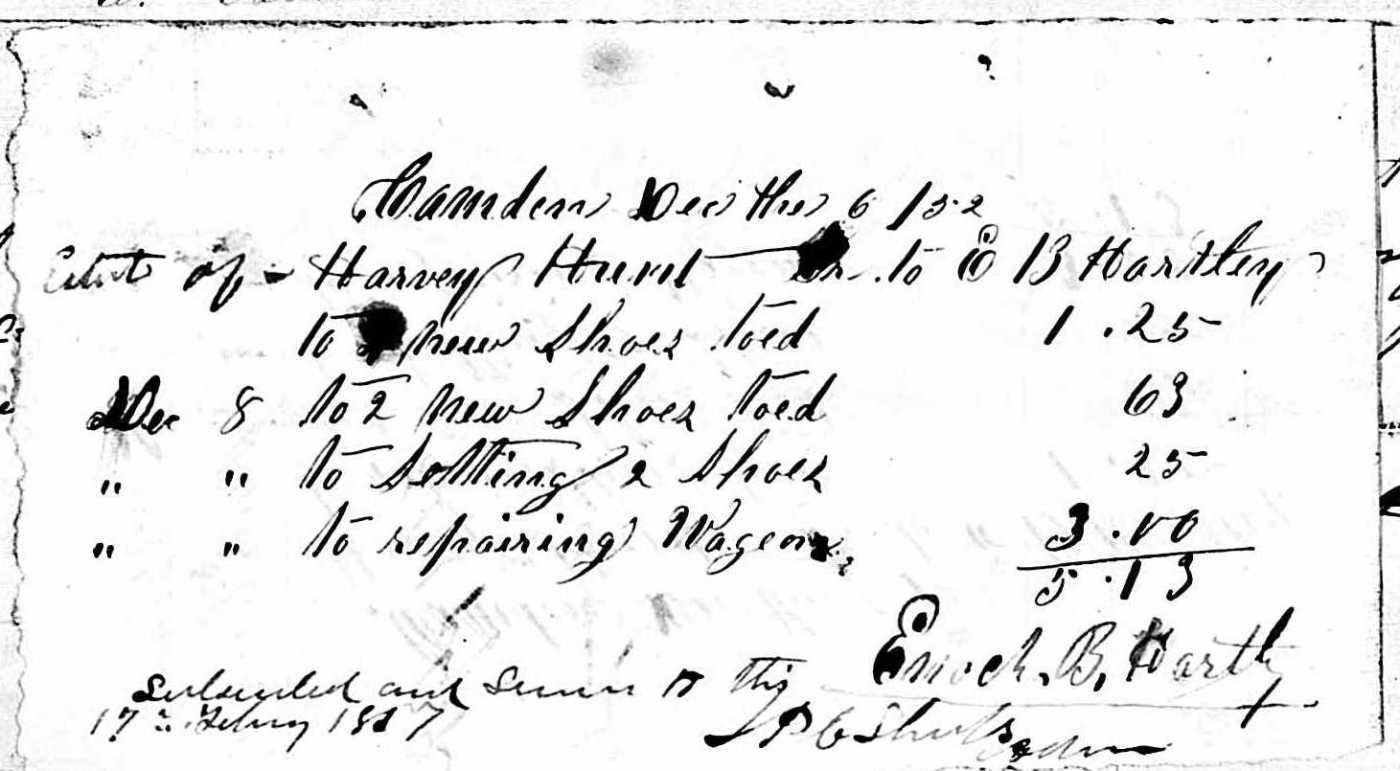 Feature image: A bill for new and repaired shoes presented to the estate of Harvey Hunt. The purchases were made before Harvey died in 1852, but not presented to the estate until 1857.