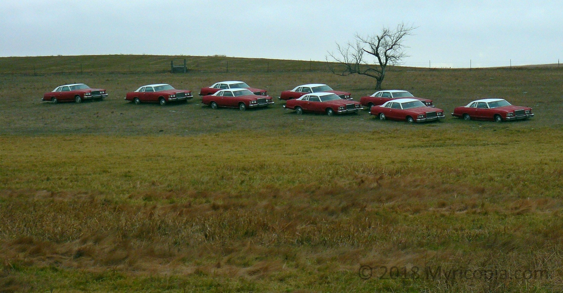 I’m sure the owner considers this a form of “landscape art.” How on earth does someone end up with nine identical cars? Especially such ugly ones in relatively pristine condition? If I saw them coming down the road toward me, I would start to get a bit paranoid. Or worse, say they came up from behind and surrounded me, each occupied by a pair of Men In Black. Yikes!