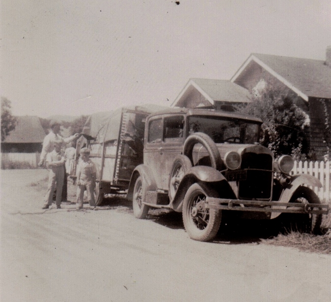 Feature image: The Halse car and trailer shortly after arriving at Uncle Al’s place in Corvallis, Oregon, in August 1942. Everett is untying the load while Treslin and Dad fidget nearby. Note the two spare tires on the car’s running board and behind the front fender.