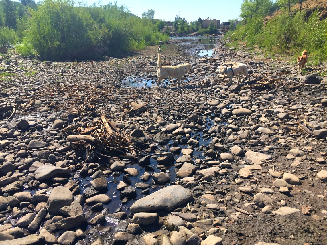 As the surface level drops, the water gets warmer, turning the rocks bright green with algae, depriving the aquatic life of oxygen. But what about the fish? Oh no worries – they all died when the ash and debris from the “416 Fire” came washing down a few weeks ago.