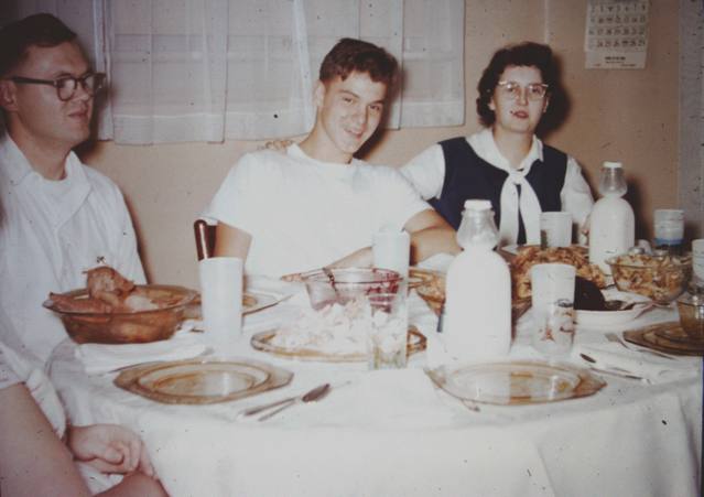 Clearly this is Thanksgiving dinner at my Grandma and Grandpa Halse’s home, in Corvallis, Oregon, in 1958, before my time. My mother is on the right, married just more than a year, and pregnant with my brother, Steve. Nathan and Tres (on the left) are two of Dad’s three brothers.