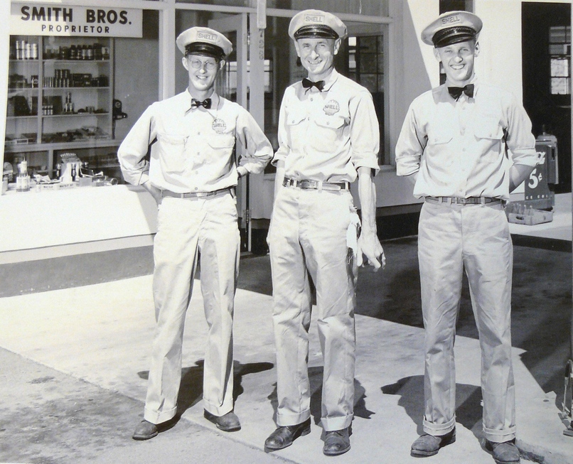 Harry Smith with his sons, Don (left) and Wes (right), at their service station in Moscow, Idaho.