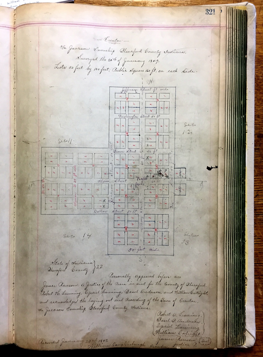 I found this 1847 map in a deed book at the Blackford County courthouse in Hartford City, Indiana.1 My Ransom ancestors lived in the town known as Trenton, seven miles due east of Hartford City.