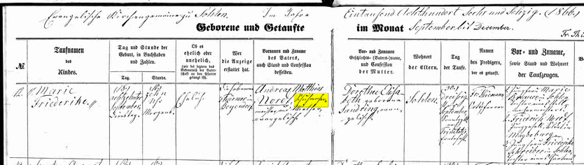 In this 1866 birth and baptism record, we can see (based on my possibly faulty deciphering) that Marie Friederike’s father, Andreas Mathias Nordt, is a shoemaker. Note that there is a combination of Latin script for the names and old style script for the other information. Click image to enlarge.