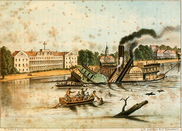 Just six months after the Blackford group went downriver, the Brilliant exploded and sank in the Mississippi, killing at least 47. (By Henry Lewis – Wikimedia Commons)