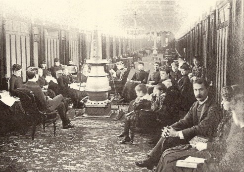 Pot-bellied stoves provided warmth. For those wishing to play cards – euchre being popular – additional tables huddled in the center of the room. There was even a piano for musical entertainment.