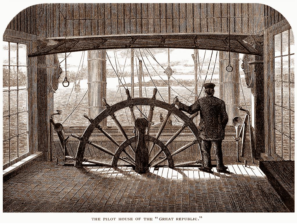 Pilot house on the “Great Republic” from Scribner’s October 1874 edition. This is probably much larger than the one on the Indiana. Note the cone-shaped tube to his right for speaking with the engineers. (Public Domain)