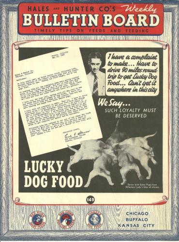 One of the pups didn’t survive the first night, but most of the rest were sold “to men and women who are good judges of dog flesh.” Carl fed his purebreds only one type of dry food: Lucky Dog Food. But he was a bit peeved that he had to make a 90-mile round trip from Peoria, Illinois, to Bloomington to buy it.