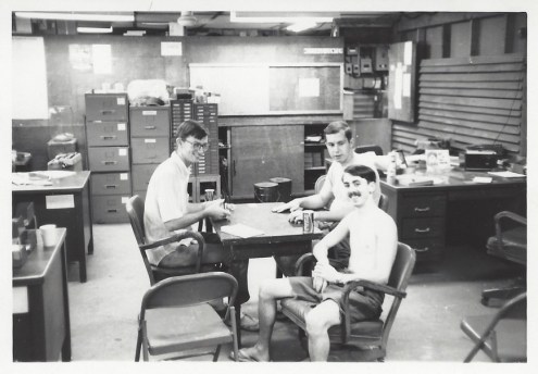 He didn’t engage in gambling, but kept aside about $20 to spend at the Post Exchange (where he could buy a bottle of Drambuie for about $3.50 and get some cigarettes, too). Or go to the USO club for entertainment. As for playing cards, he enjoyed a game of spades with his co-workers, or cribbage with his “hooch-mate.”