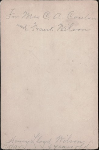 I enjoy finding 19th century photographs in the local antique store that have some identifying marks. This photograph of 6-year-old Henry Lloyd Wilson caught my eye, despite the defacing scratches. It has so much information: his age, the date the photo was taken and where, and to whom it was sent.