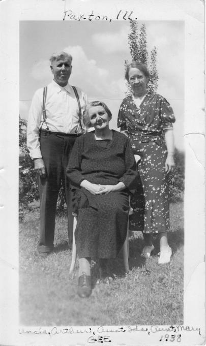 Arthur Gee, Ida (Cavan) Gee, and Arthur’s sister-in-law, Mary (Kenney) Gee, widow of George Gee. Taken at a family reunion in Paxton, Illinois, in 1938. (Shared by dspberg on Ancestry.com)