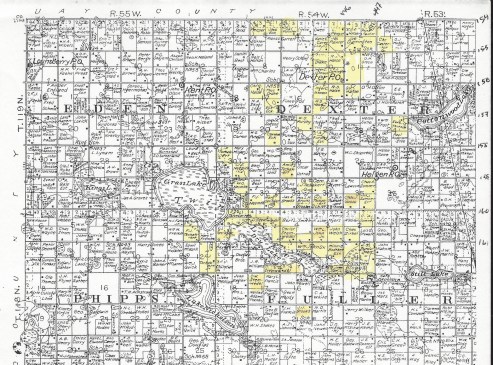 Selection from the Codington County property map from 1902, highlighted to show ancestors and related families. (Click to enlarge)