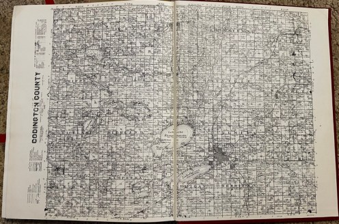 My uncle loaned me this book about the history of the county, which contains many family biographies, as well as stories about the various townships and cities, and reminiscences about “the old days.” Inside the back cover is a property ownership map from 1902. (Yes, it does require a magnifying glass!)