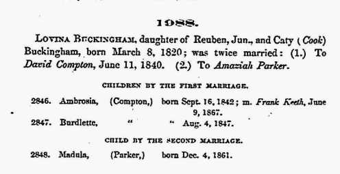 Soon my browser has one person open on five different tabs, and I’m working on ten people at once. Yikes! You might find a clue you need on a different person’s page, so it helps to run parallel investigations. Ambrosia’s mother had a link to a Buckingham family history that gave (unsourced) birth and marriage dates for several people I was working on.