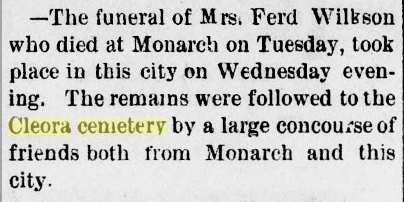 “The funeral of Mrs. Ferd Wilkson who died at Monarch on Tuesday …” (Louisa Marshall)
