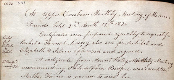 Feature image: Upper Evesham Friends Meeting House in Medford, New Jersey. This was the last Friends meeting that Philadelphia Bedford attended, arriving in early 1820. (Wikimedia Commons)