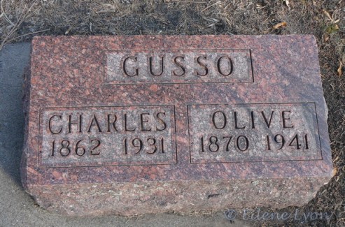 - Codington County (SD) Marriage Book A, p. 136. “Charles J. Gusso, age 27, farmer and Olive Springer aged 19 [sic] were by me a duly elected Justice of the peace City of Watertown 28th March 1889 at 12 oclock in the presence of William L. John and Flora John.” (The witnesses were younger half-siblings of Charlie Gusso.) ↩