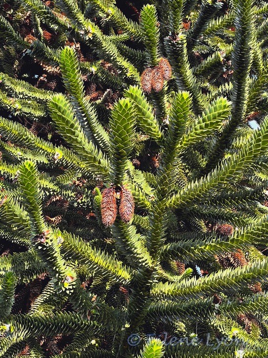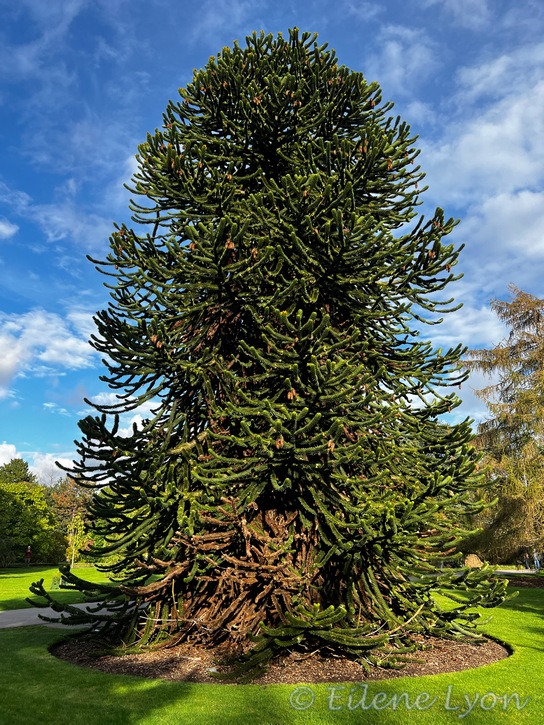 I have randomly seen Monkey Puzzle trees all my life Eilene! They do grow in WA, not always very well, but I remember seeing a few as a child and now… one block away lives a huge MP tree that I walk under often. Everyone that I can remember seeing was positioned in an “older” neighborhood (even my local one) and already quite large so their lower branches were/are already leaning down, clearly planted long, long ago.