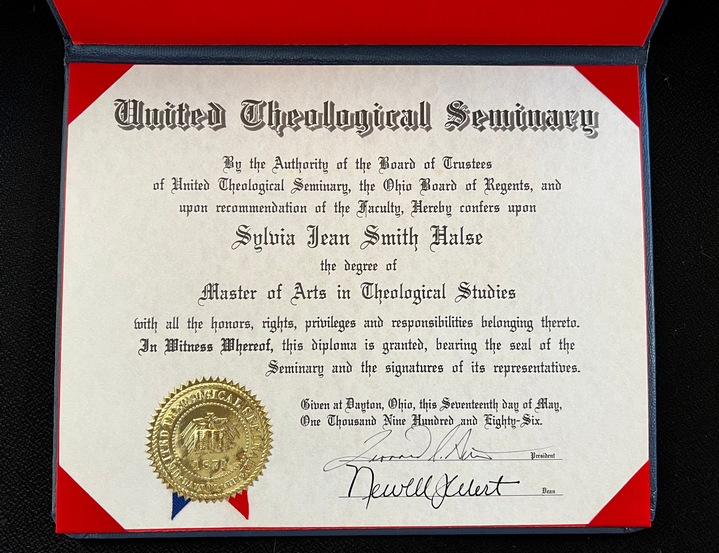 My mother’s Master’s degree diploma from the United Theological Seminary, 1986.
