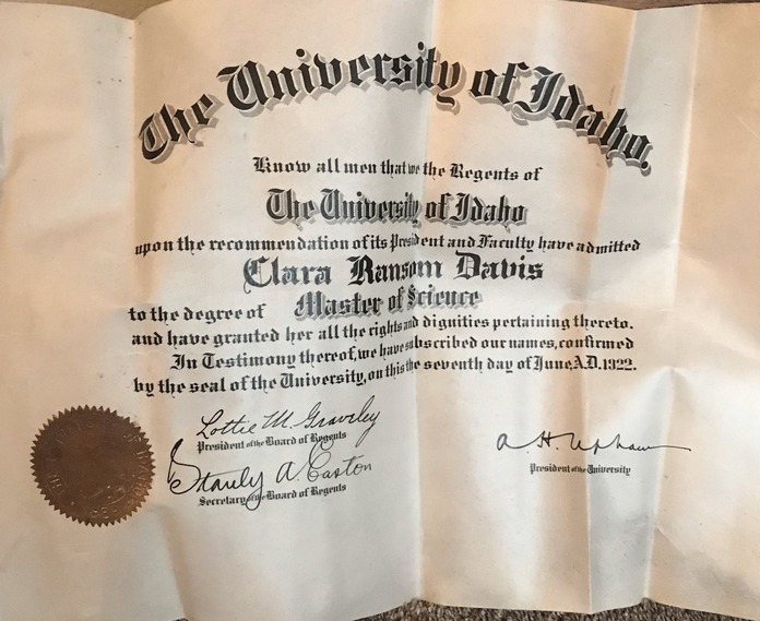 I come from a line of college-educated women, going back to my great-grandmother, Clara Ransom Davis, who was a graduate in the third class of the University of Idaho (UI, Moscow) in 1898. She ensured her niece, nephew, and two daughters all went to the University.