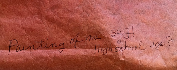 By the time Mom wrote this note on the pink cover, she had obviously forgotten the time and circumstances of its creation. When, where, and why was it painted? How (sitting or from a photo) and by whom? The backing is canvas, such as is used with oil and acrylic paints, but which type is it? Did it have some particular purpose? Was there an associated special event in her life? Why was it never framed and hung?