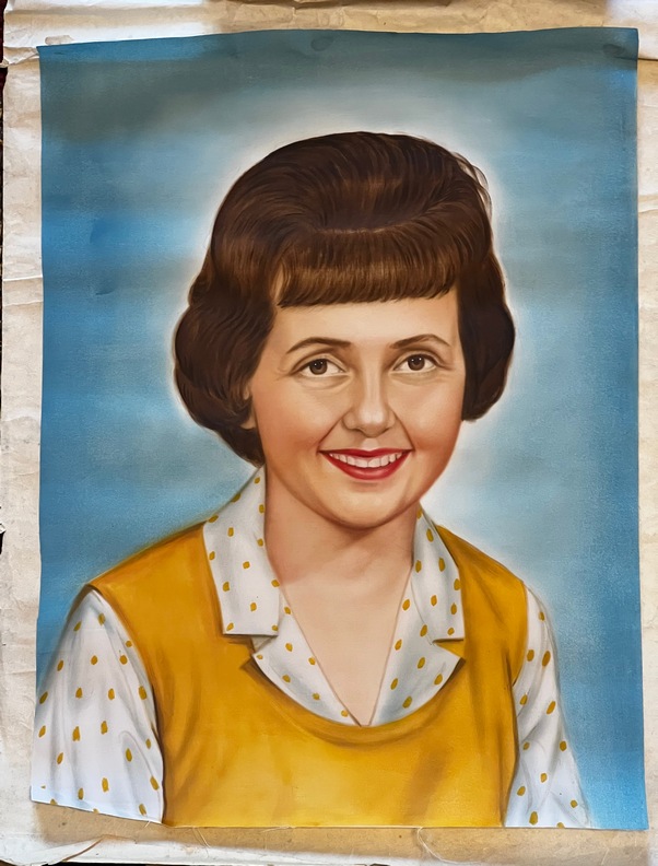 Not high school since she didn’t even have bangs in high school. I think the 1966 photo is closer to how she looks in the portrait than the 1969 photo. But it also could have been later than that. If she has crow’s feet, that seems more like her 40s—so in the 1970s??