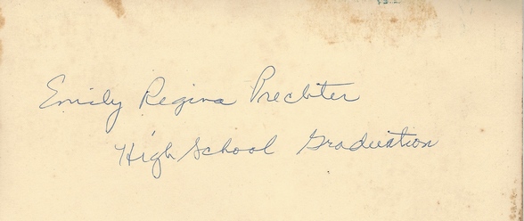 The two largest portraits, which have been successfully reunited with family, are both from New Orleans. The first is an 8 x 10 hand-tinted portrait (feature image) with a painted bouquet of roses. It is labeled on the back as “Emily Regina Prechter—High School Graduation.” I love nothing better than a full name, and a unique one, at that.