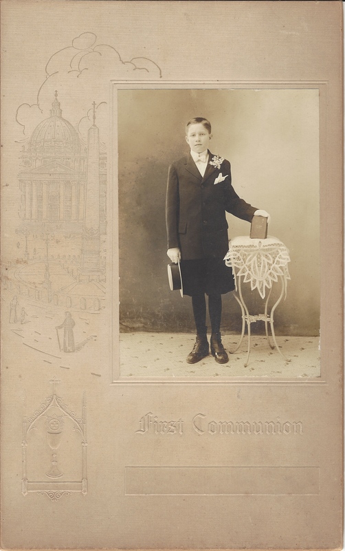 The second portrait is of a boy about 12 years old and the mounting board states it commemorates his “First Communion.” The back is labeled “Gussie Faust.” I assumed a first name of Augustus. By magnifying the image, I could see his Bible was embossed with “A J Faust.” Again, it took little time to find August Joseph Faust on Ancestry.