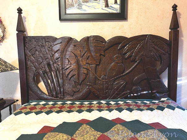 I created a jungle scene for the headboard. Bob, the teacher, teased me about killing tropical trees to carve the tropics in them. I didn’t let it stop me. The headboard carving took me a couple years, then another year to build the rest of the bed. (We only did classes during one school term each year.)
