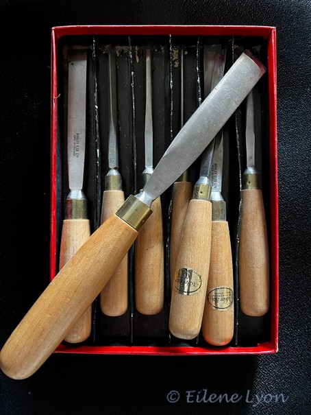 Carving tools, by the way, are extremely sharp. That never caused me any trouble until one evening. A Bayfield student, who was carving a dining-table top, visited our adult class to see my project. He asked, “Have you ever cut yourself with one of the tools?”
