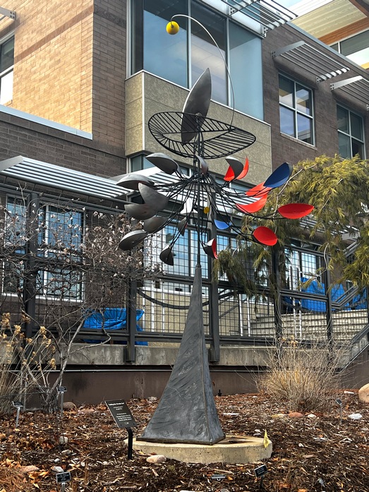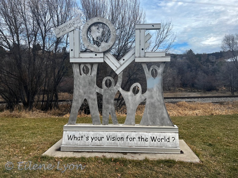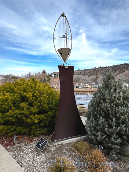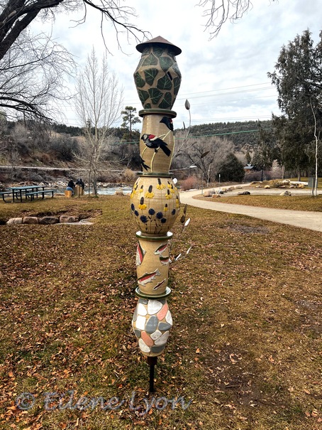 “The Guardian” by Mick Reber. Another of his works is in Santa Rita Park, which I put in an earlier “Artful Durango” post.“Animas River Inspiration Wheel” with ceramics by Kim Adams and metal work by Jim Philpott. Next to the sculpture is a box with paper and pencils, inviting you to use them to draw or compose what the Animas River means to you. Then you place it in the top vessel and spin, sending your inspiration out to the universe. (There is another small sculpture behind this peeking out).
