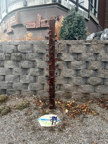 I neglected to get the name and artist of this piece. The yellow globe at the top spins on its wire.This piece did not have a plaque identifying it. It is an obelisk with clematis vines. The tile below it says “Help Us Grow.”“InfinitI II Wind Harp” by Ross Barrable. Perhaps there was no wind while I was there. I don’t recall it making music.