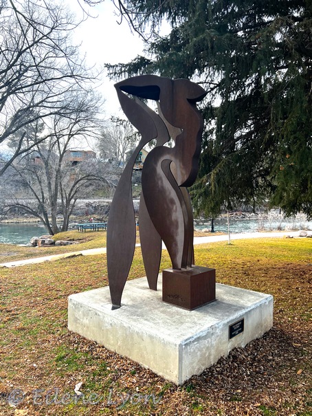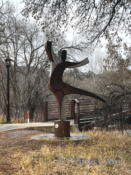 Let’s take a walk on the north end of the River Trail along the Animas through Durango, Colorado. We’ll start with some art by the library. Most of the works in this post are metal sculptures, designed to work well outdoors.