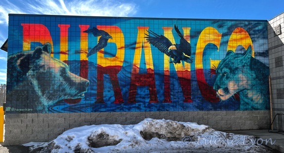 “Durango” mural by Parker Hi Art on the side of a Main Ave. car wash.A joyous figure near one of the footbridges across the river.Just behind the school is this hopeful, global-minded work.